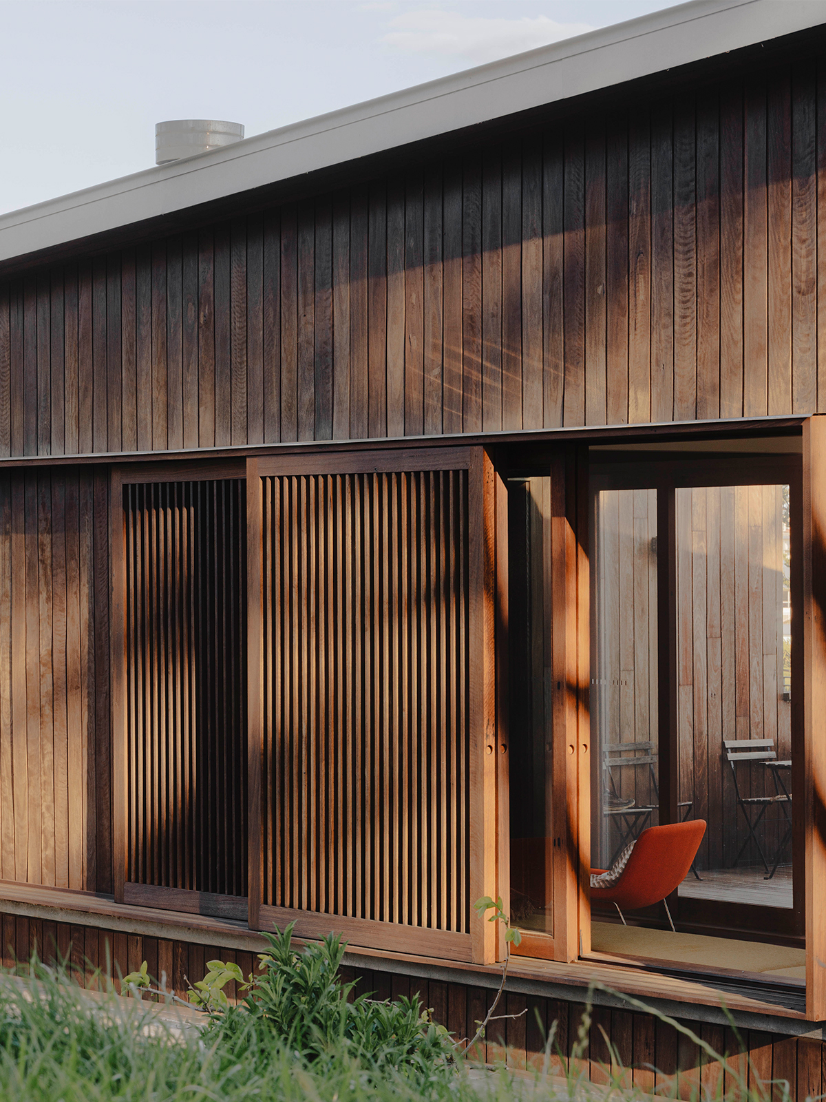 | Situated on a steep, windy slope, the pavilion is elevated on a steel platform, its recycled ironbark cladding weathering the coastal conditions. The design carves out a central, protected deck, offering a quiet respite from the relentless winds that shaped the architect’s personal connection to the site as a windsurfer.